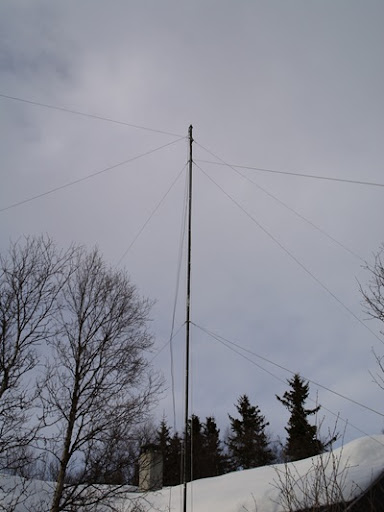 Bildet ovenfor viser antennemasten når den endelig er kommet på plass. Øverst er fødepunktet til den hjemmelagde windomantenne som jeg laget i fjor. Det er ledningene som er øvert til venstre og øverst til høyre som tilhører windomantennen.